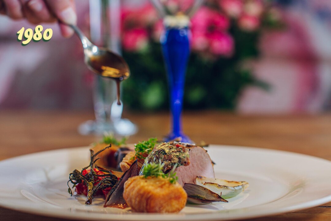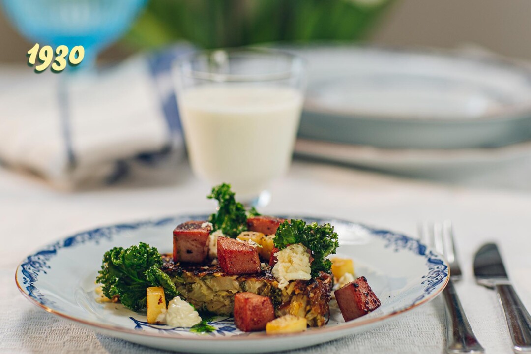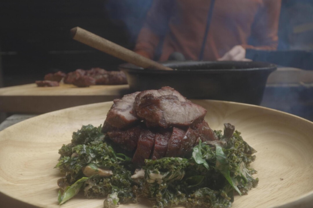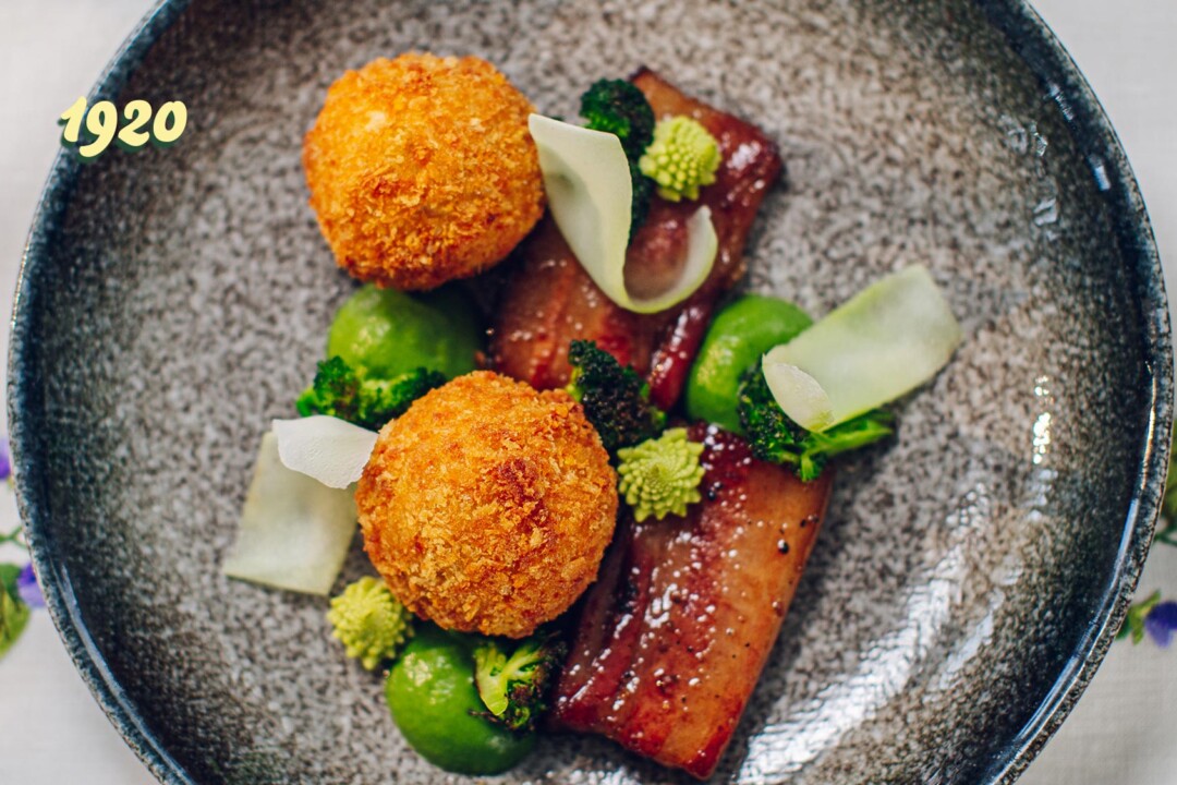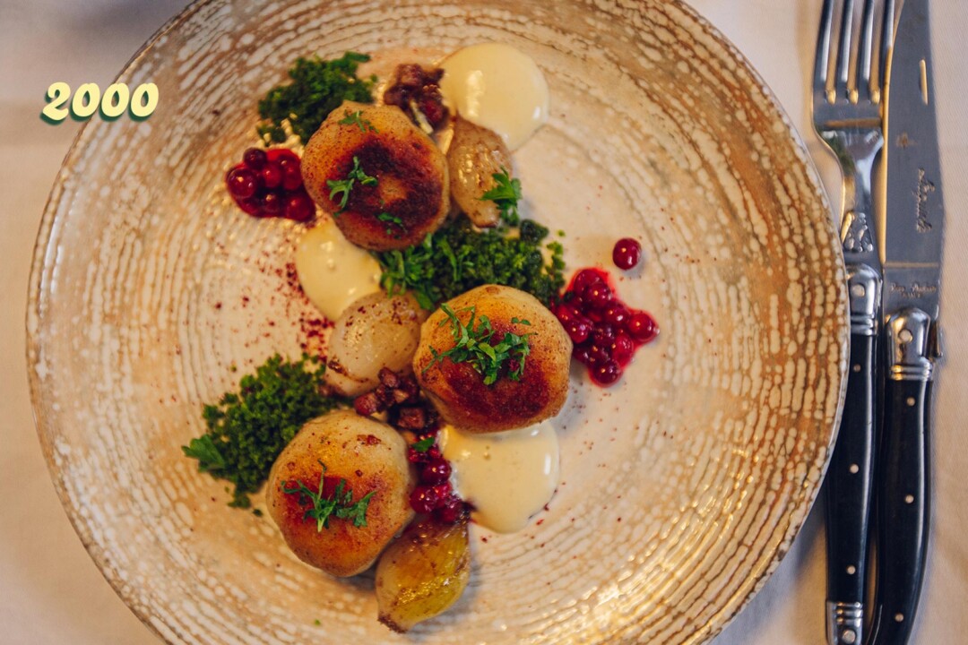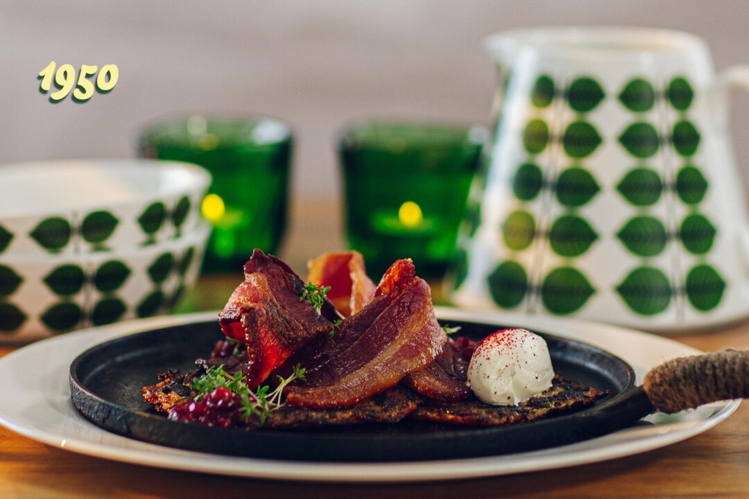med varmrökt sidfläsk, lingongrädde, brynt smör och krispigt persiljebröd