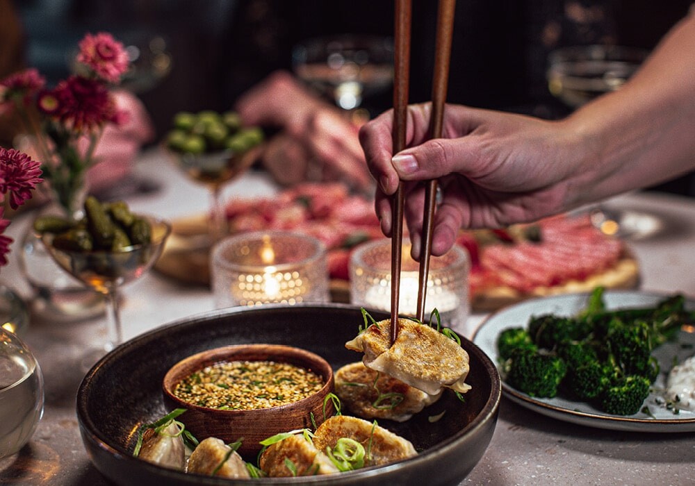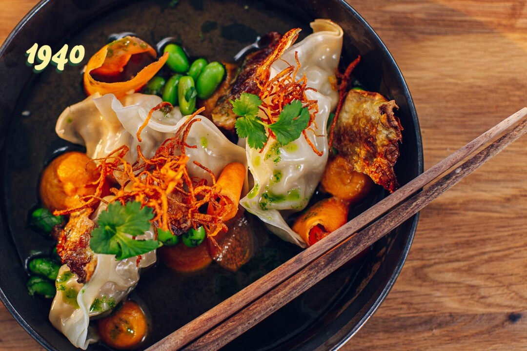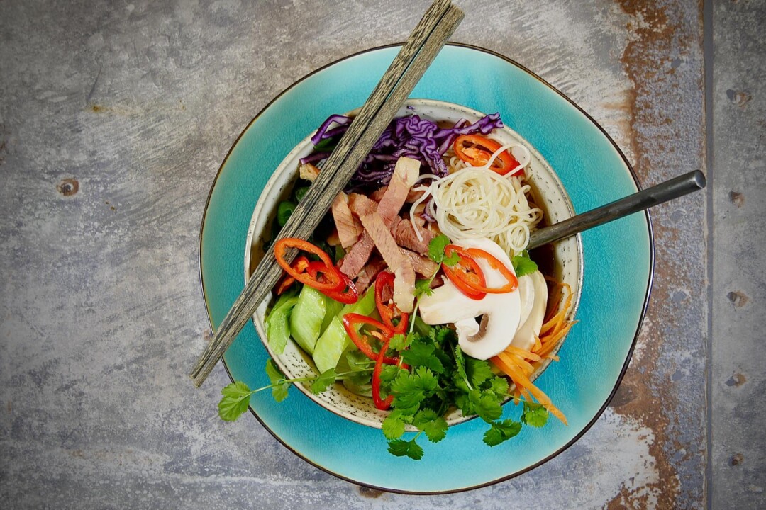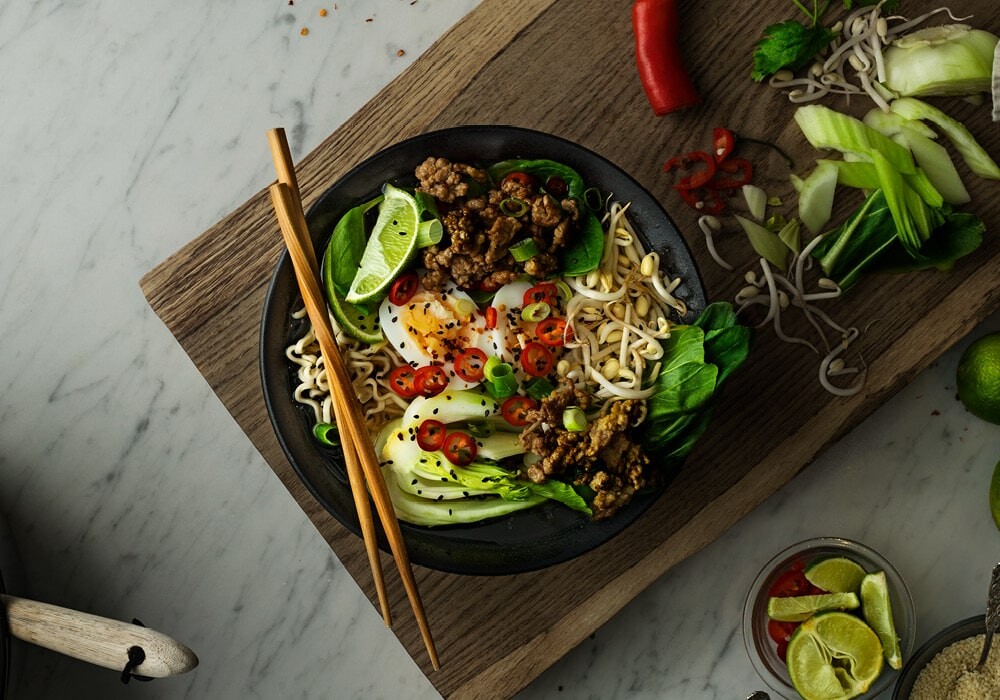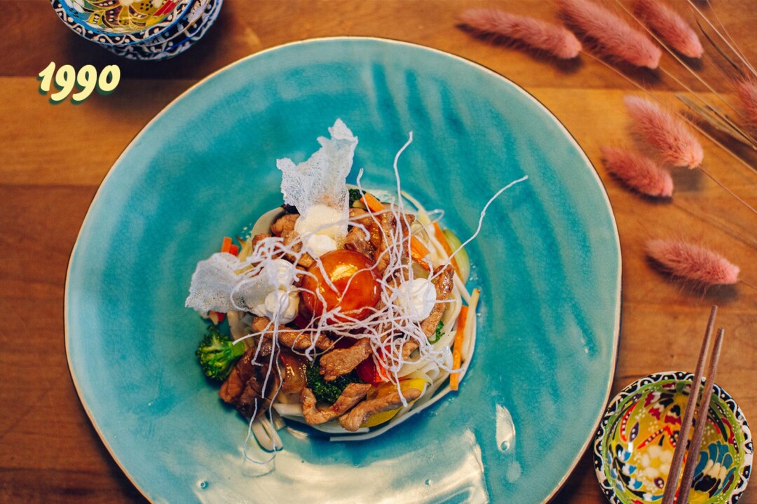 med hoisinmarinerad pork, grönsaker, udonnudlar och sojamarinerad äggula