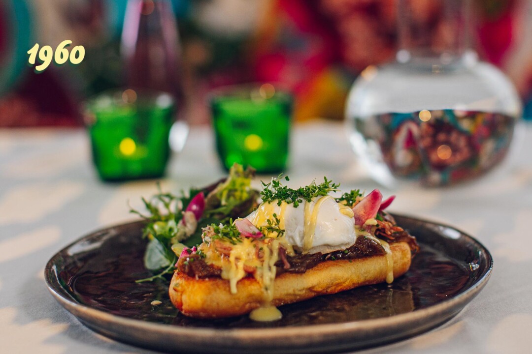 på smörstekt brioche med dijon, ölbrässerad lök, pocherat ägg och gruyère