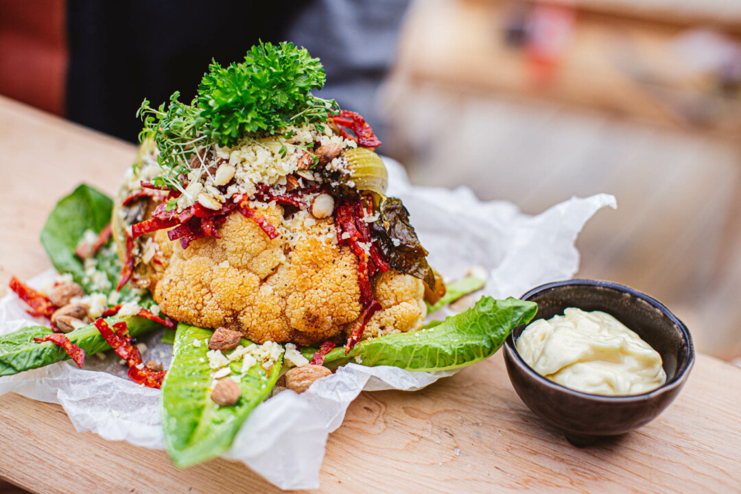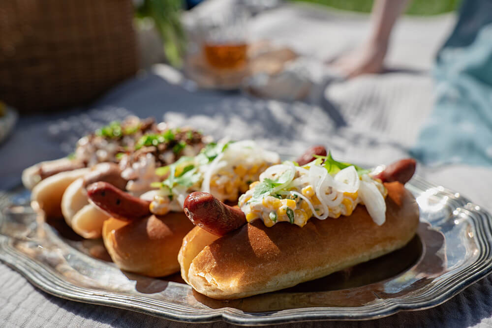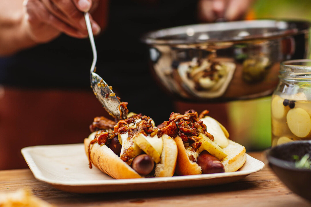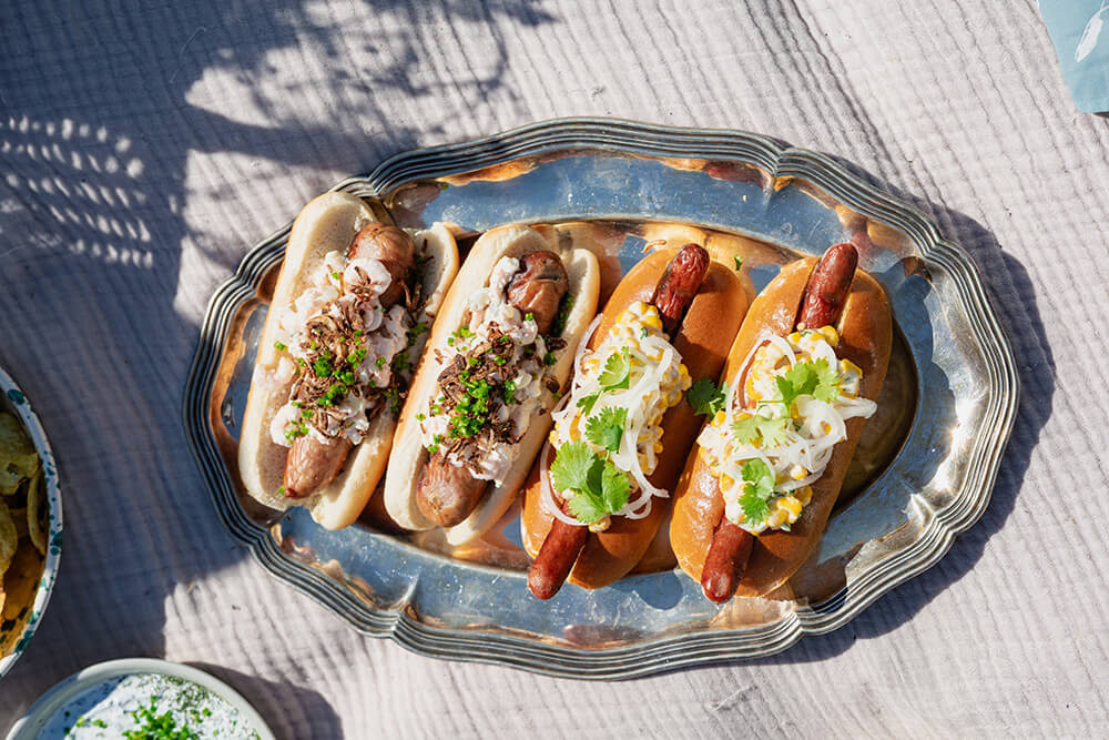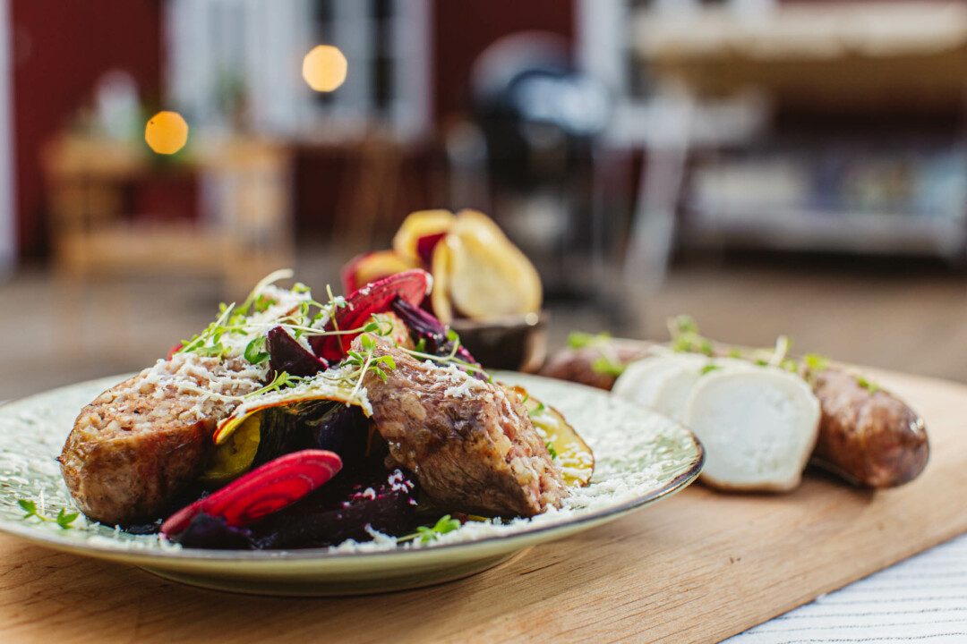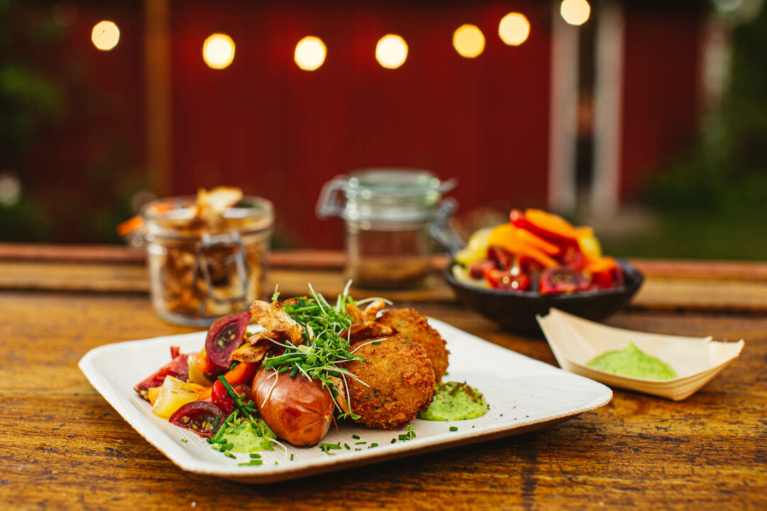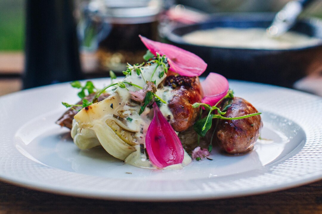 med nordiska smaker: äpple, lök och pepparrot, krispig fläskkorv och kålrotsmajonnäs