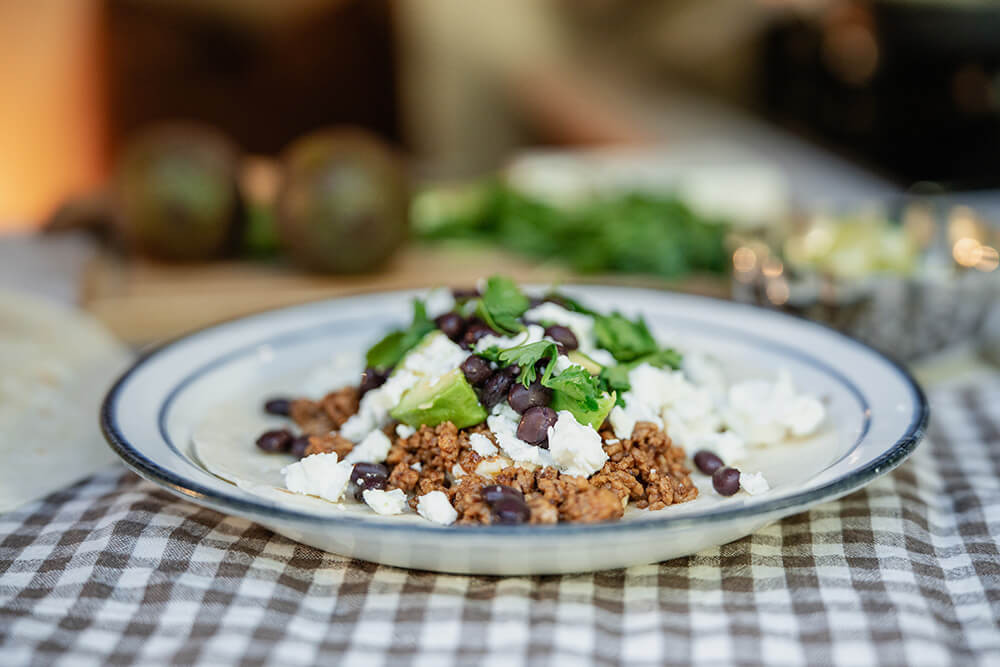med krämig äggröra, fetaost, avokado, svarta bönor och krispigt fläskfärs