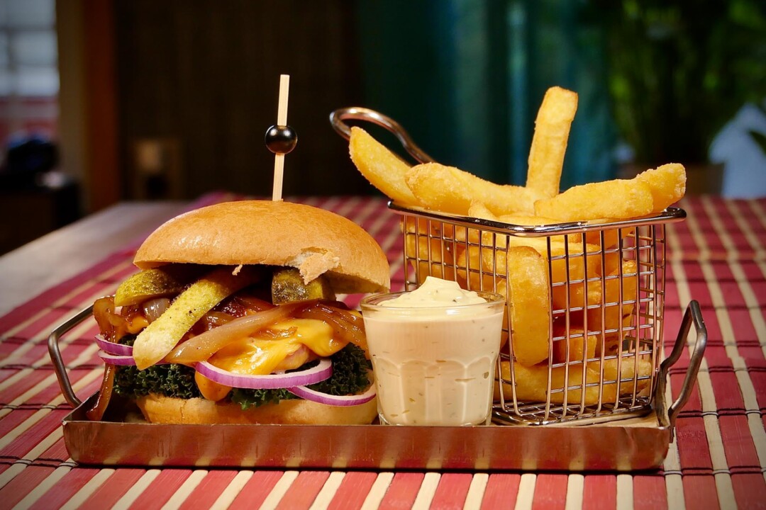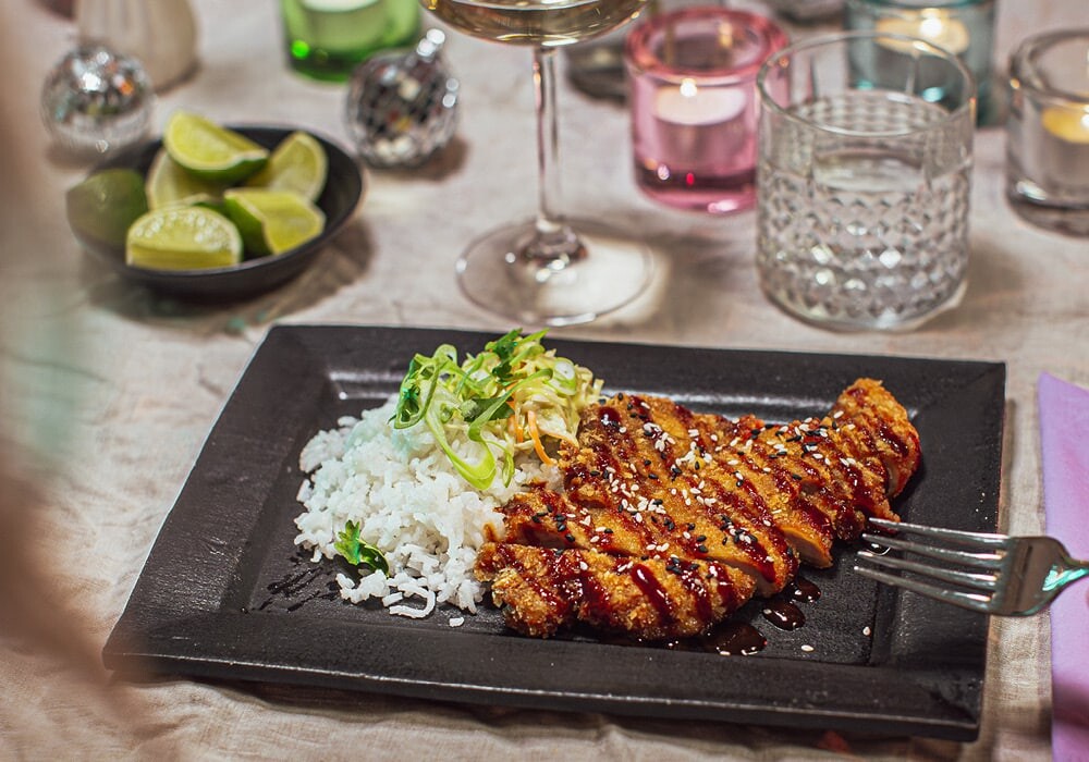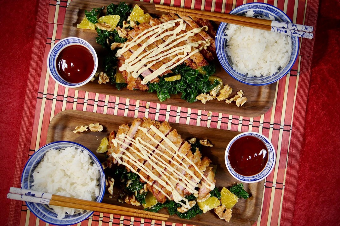 med dijonsenapscreme, tonkatsusås och grönkålssallad