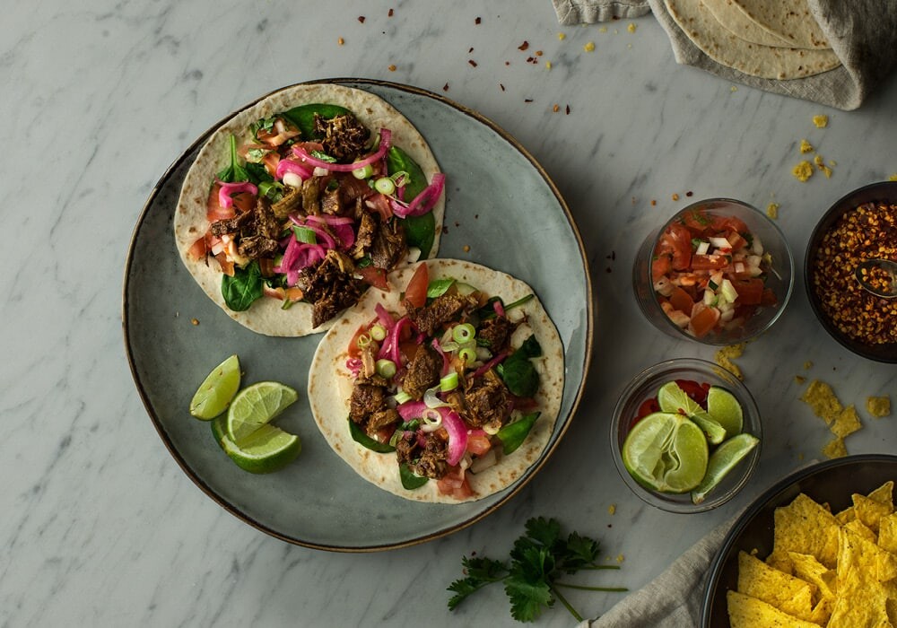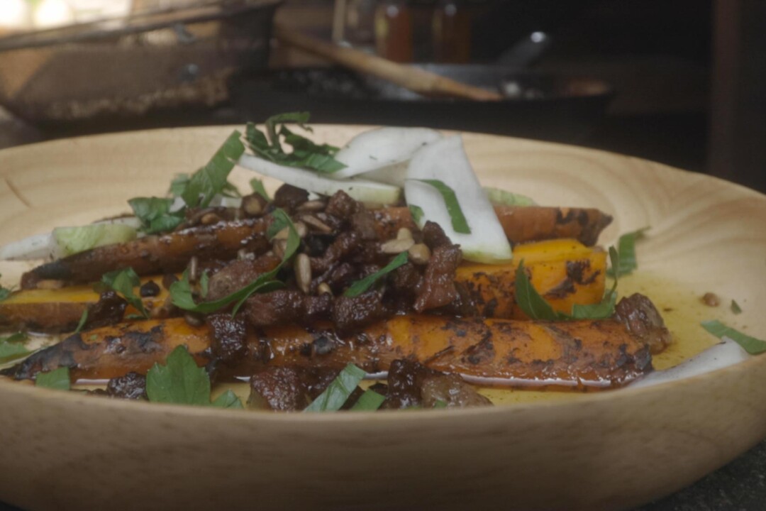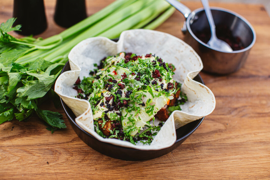 med BBQ-bräserad rotselleri & chorizo-crisp