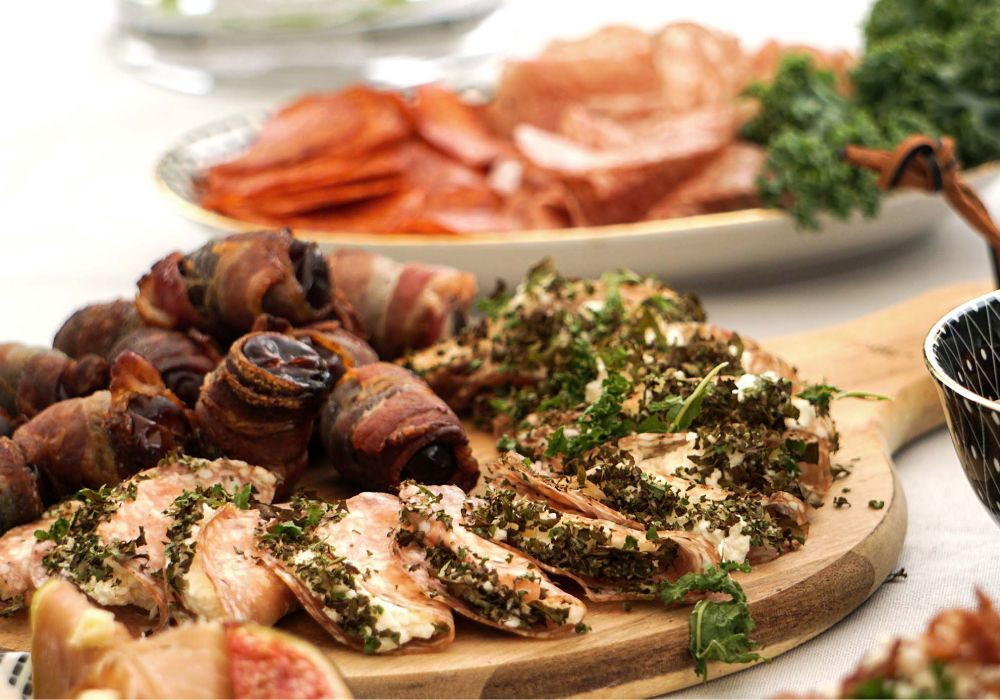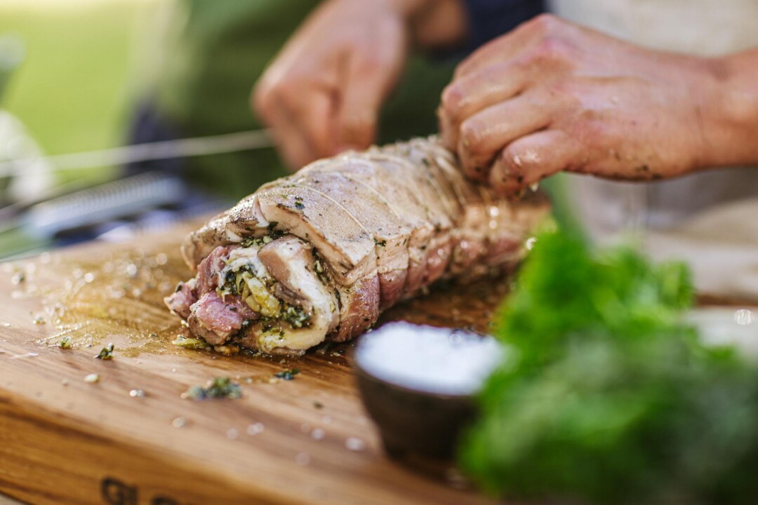 med vitlökskräm, kapris, tomat och grillad fläskkarré med honungs glaze