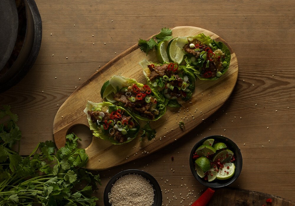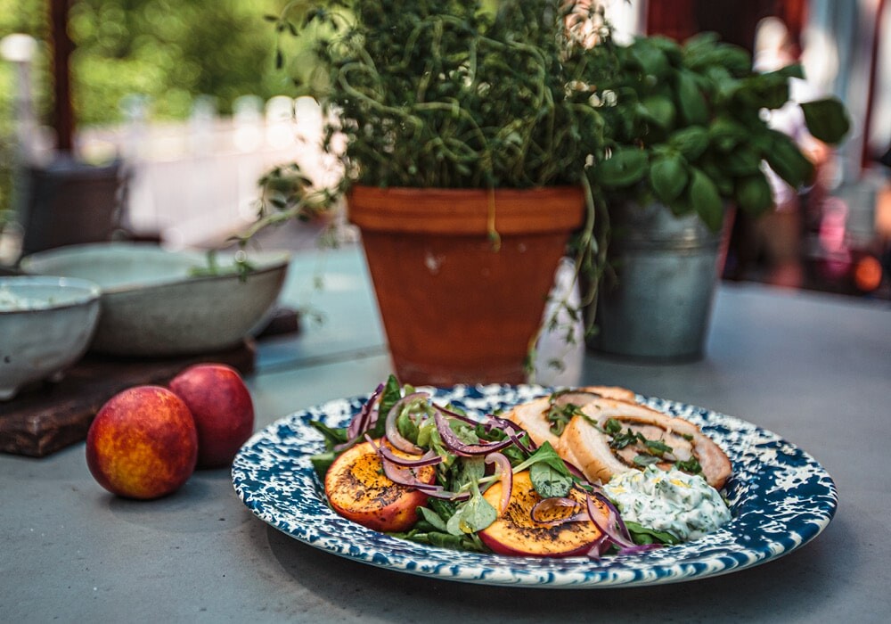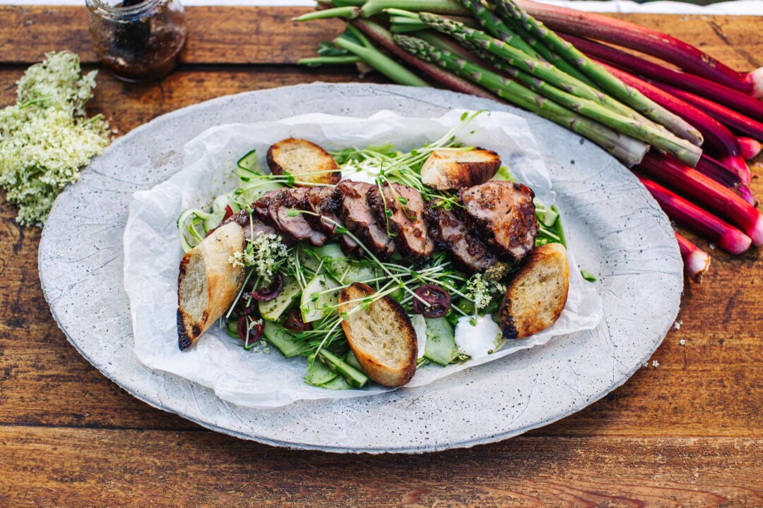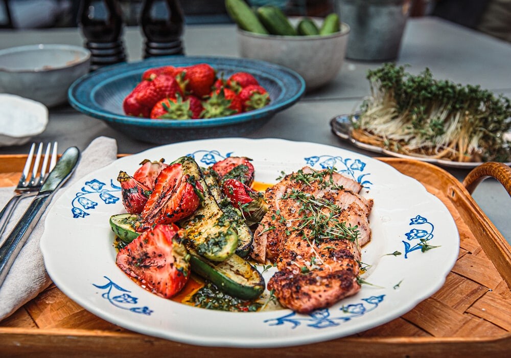 med ramslöks-chimichurri, grillade jordgubbar och slanggurka