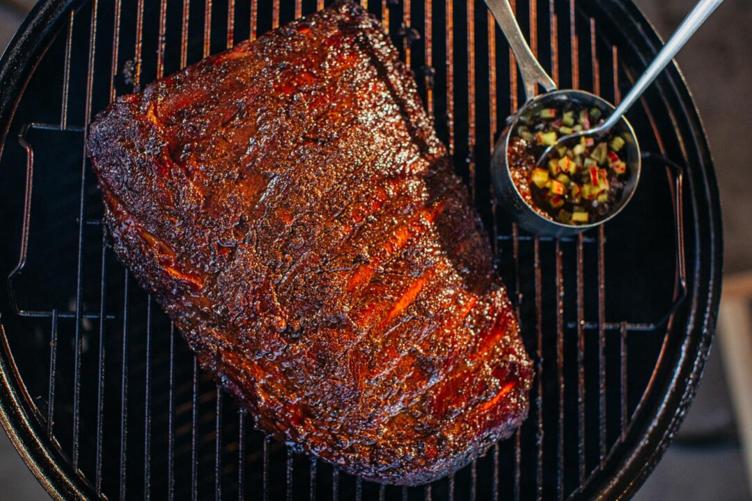 med lagrad cheddar, jalapeño, tre sorters broccoli och lönnsirapstekt sidfläsk
