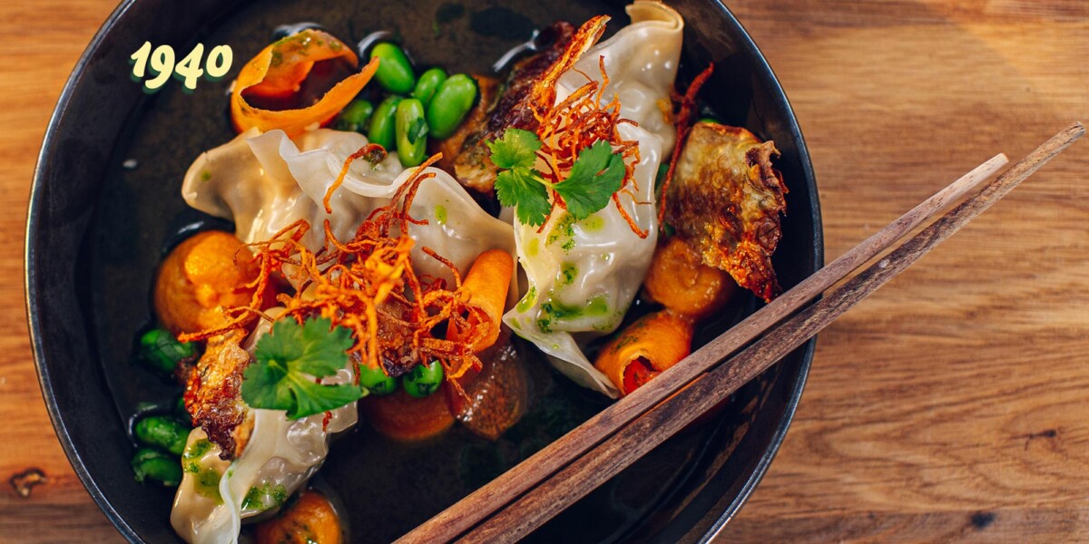 Dumplings i kålbuljong med ingefära, sesam, morot och sojaböna