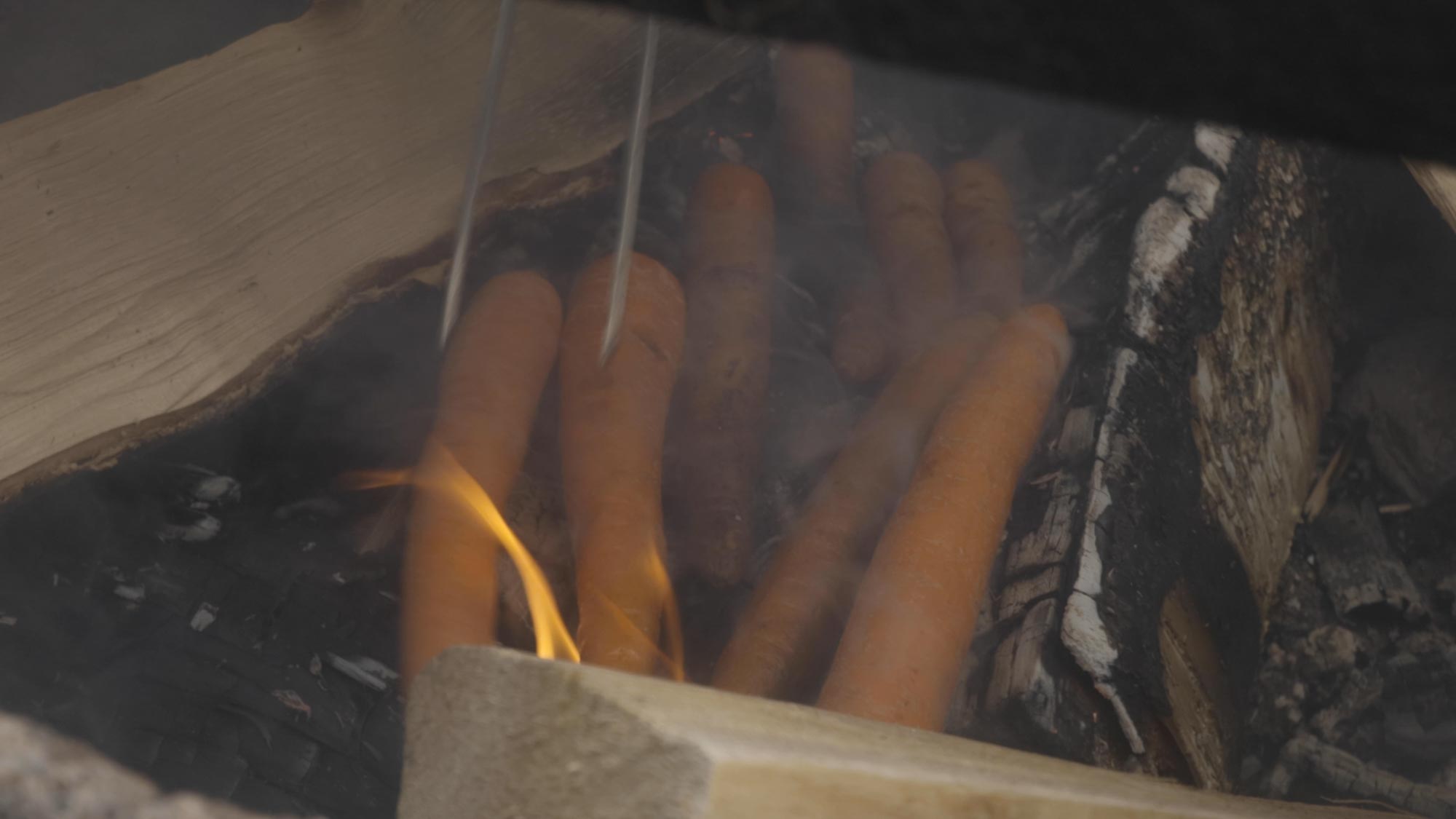 2. Lägg morötterna direkt i glöden, snurra dem var 5:e minut i 20-30 minuter