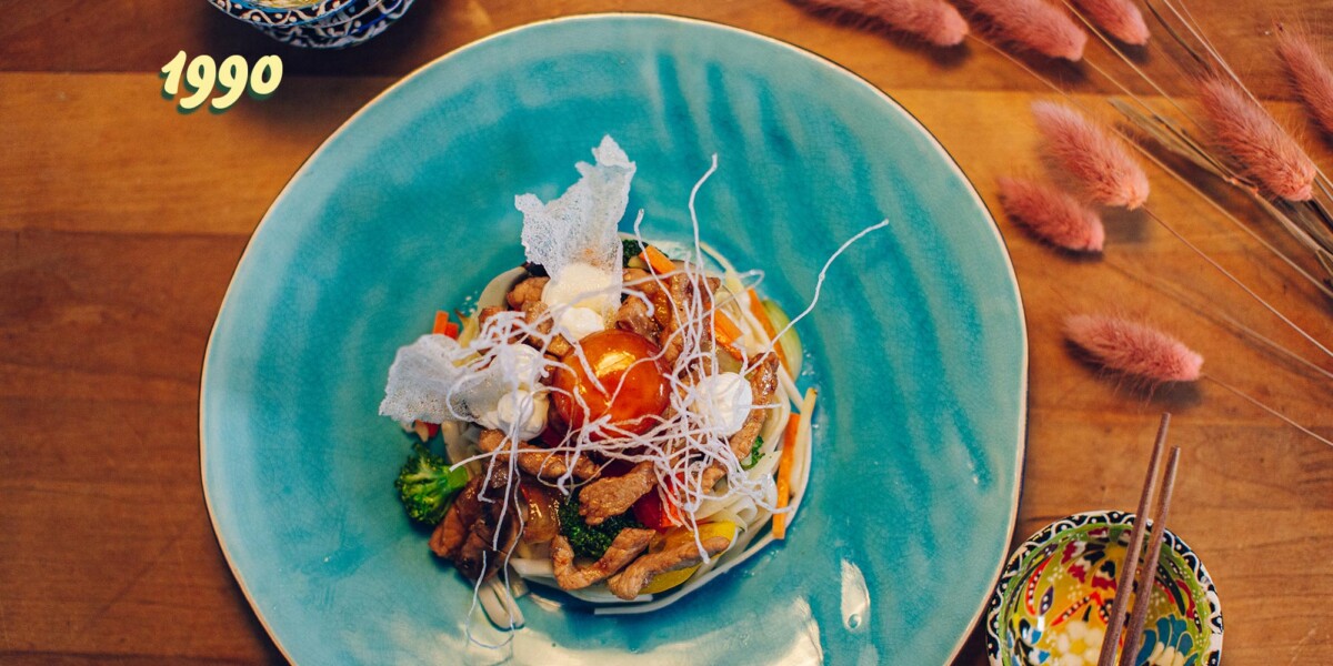 Med en hommage till 90-talet presenterar vi här en uppdaterad variant av woken. Vi serverar den isärplockad med hoisinmarinerad pork, grönsaker, udonnudlar och sojamarinerad äggula. Yummie!