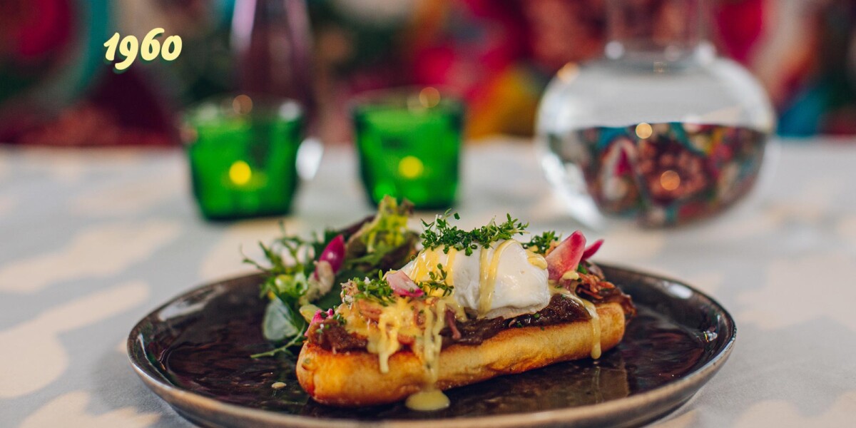 Mörkokt fläsklägg på smörstekt brioche med dijon, ölbrässerad lök, pocherat ägg och gruyère